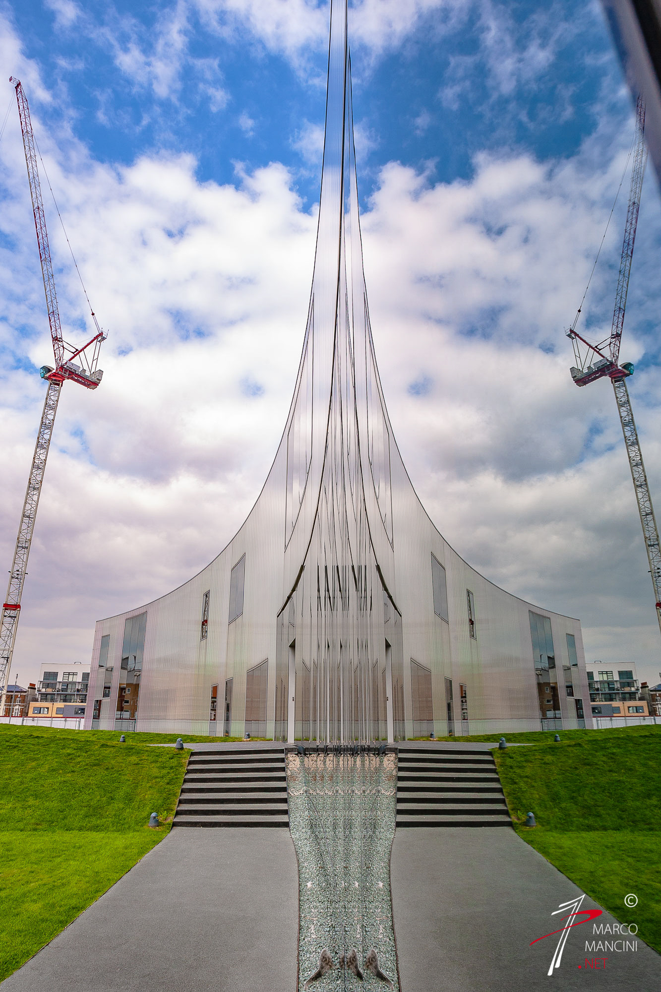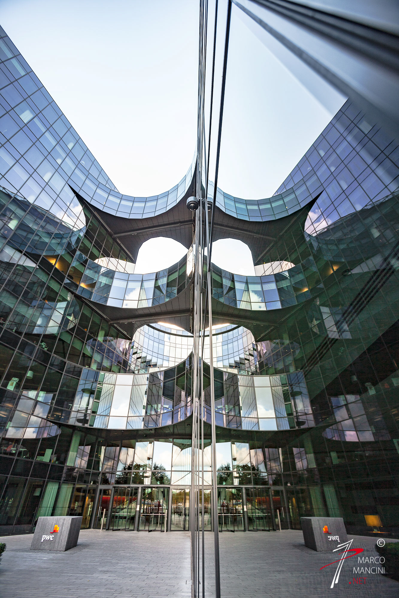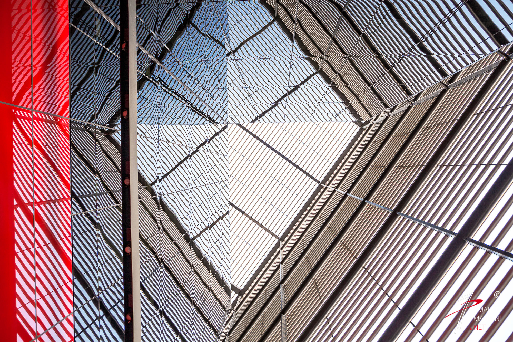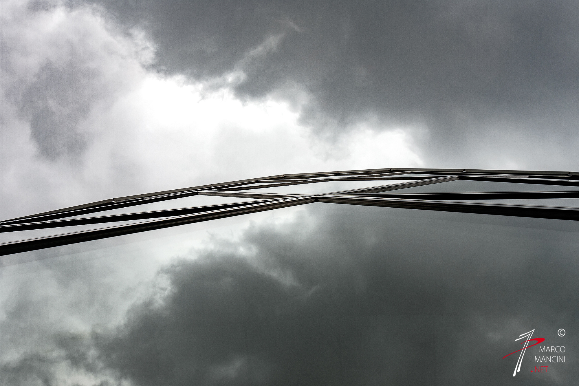 Like a game, the reflections allow you to deceive the reality. So a skyscraper lurks behind the thin metal structure that stands out in the sky and the geometric effects of light and shadow are amplified to the point of losing the size of the forms that generated them.
